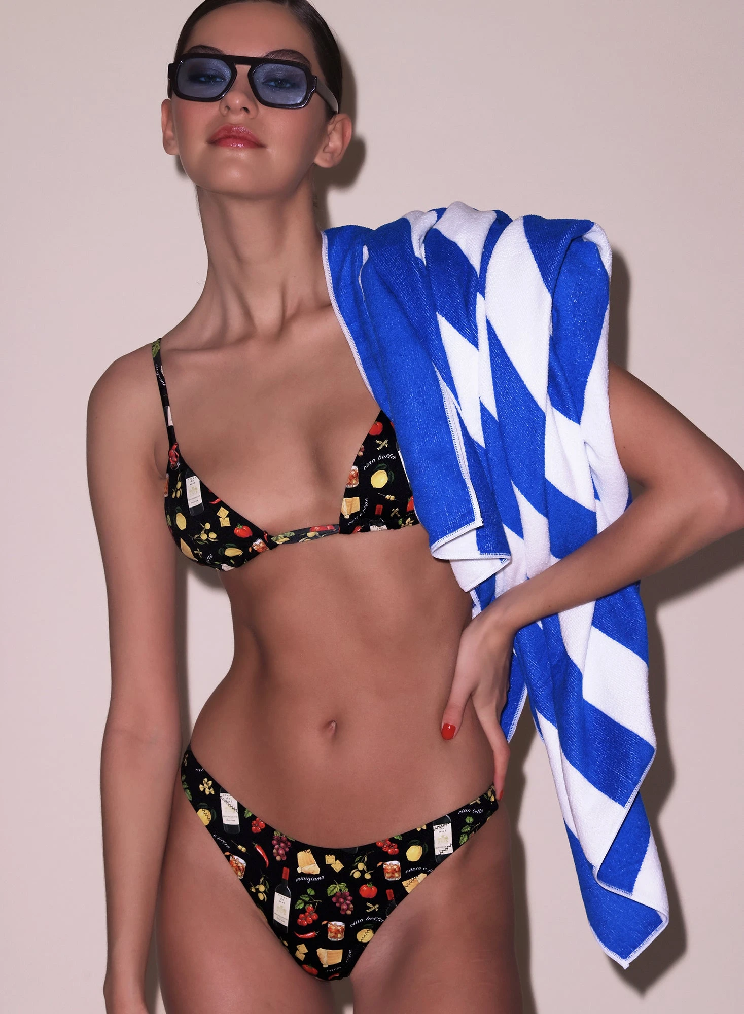 Adult swim. Our Grommet Triangle Bikini Top, illustrated with hand drawn Italian inspired motif. Cut from Italian stretch fabric that retains shape, with adjustable straps and grommet detail. Fully lined. Pair with the matching Grommet Bikini Bottom for a smoking hot swim set.