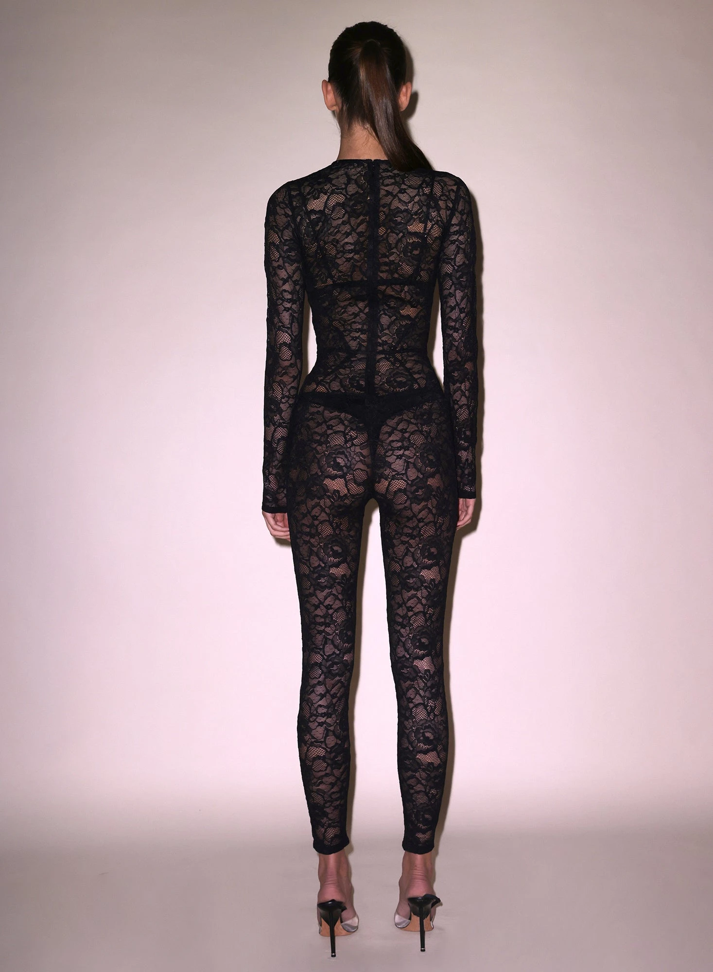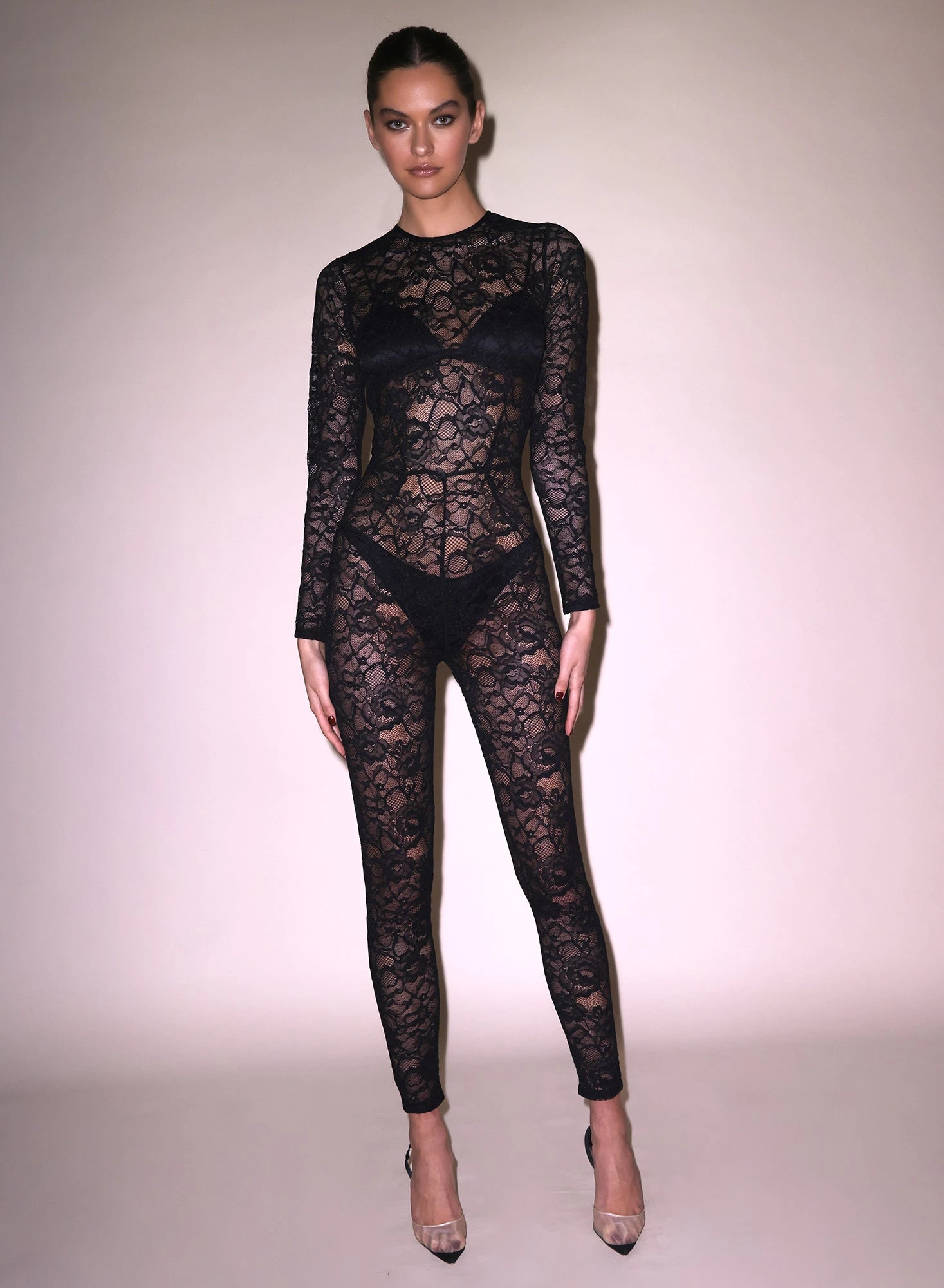On the prowl. The perfect combination of chic and provocative, our ultra sexy Lace Catsuit is meant for dressing up and undressing. Center back zip, cut from stretch Leavers Lace. Seam detailing at waist to flatter your figure. Unlined. Make them purr with Luxe Triangle Bra and V String, or flaunt all on its own.