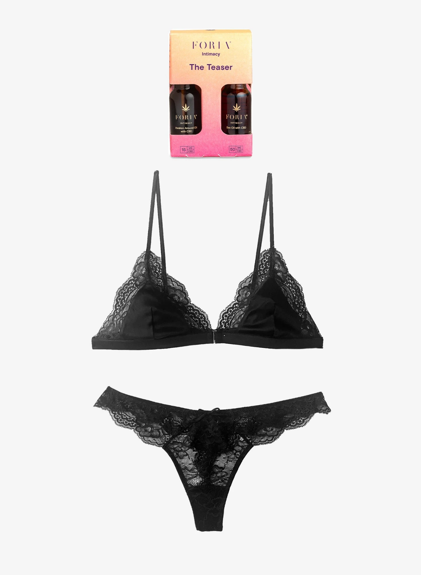 Our ultra hot Naomi Teaser Gift Set, featuring best selling Naomi Lace Thong and matching Naomi Lace Triangle Bra. Includes The Teaser set, with Foria’s Awaken Arousal Oil and Sex Oil so you’re ready for a good time anytime, anywhere. Beautifully gift wrapped in Fleur logo box with black ribbon bow.